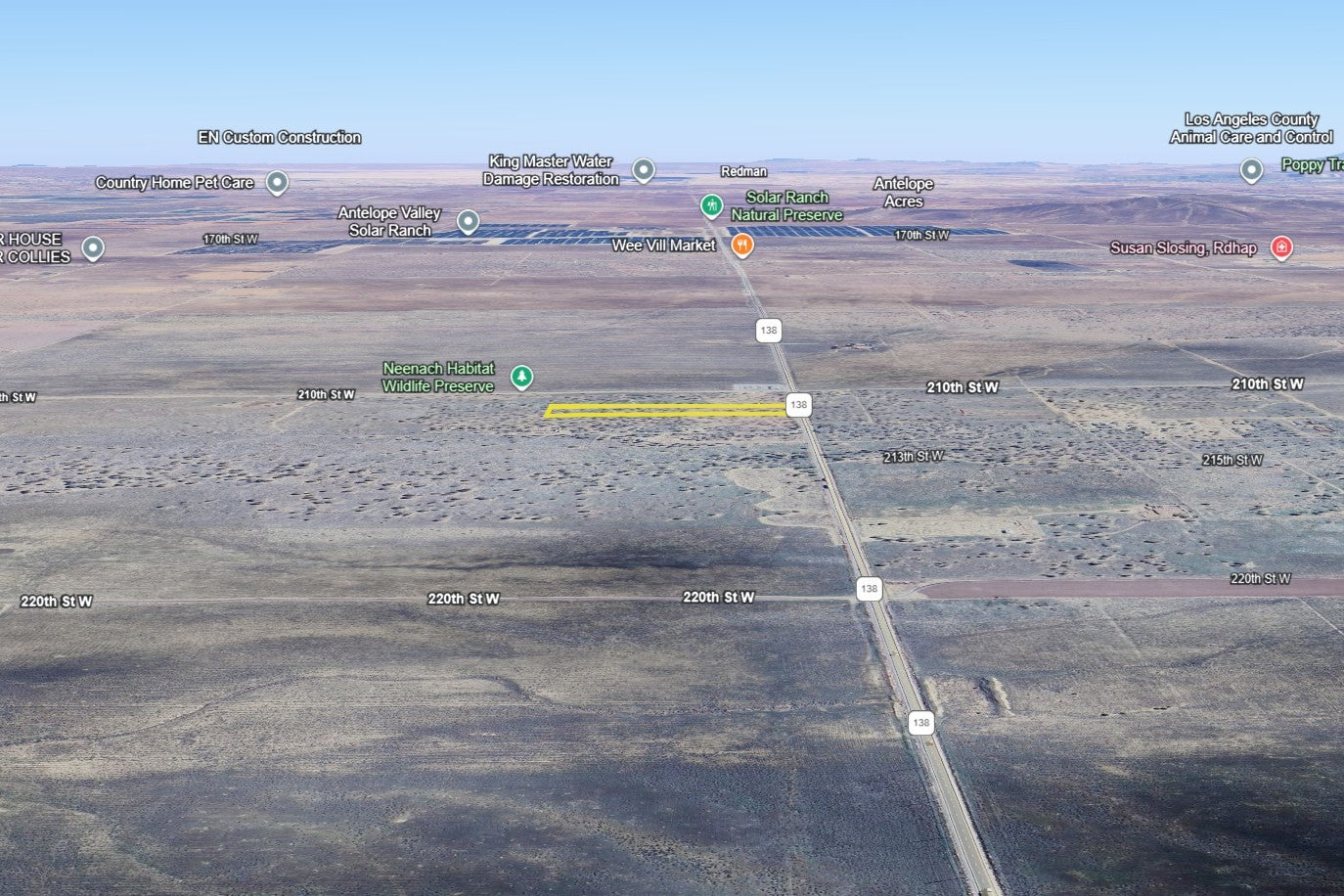 Enjoy wide-open space and convenience with this 9.77-acre property in Lancaster, Los Angeles County! It’s surrounded by scenic desert views and peaceful open skies, offering both comfort and opportunity. With power lines nearby, you’ll have a convenient head start for future plans.